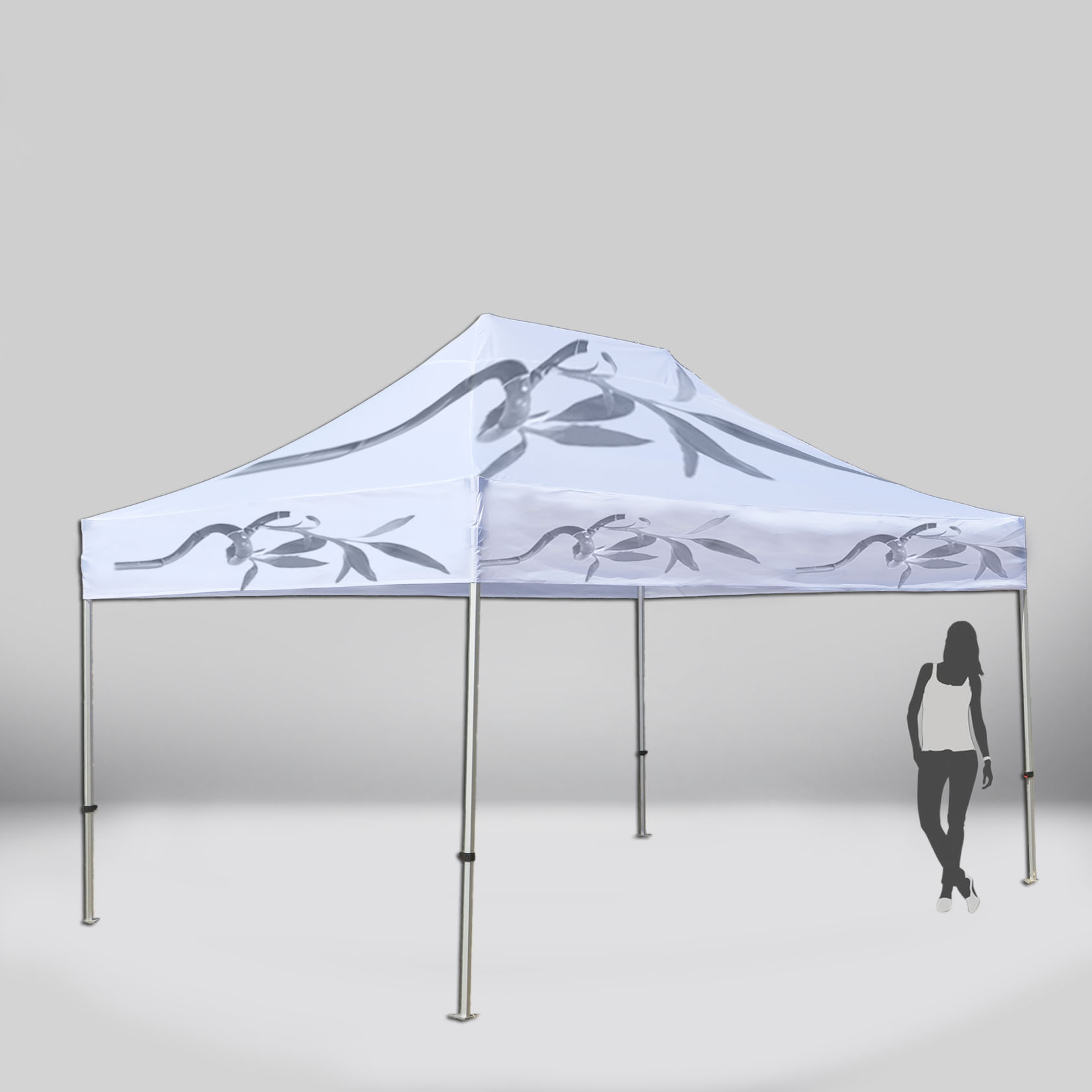 Carpa plegable de 3×4,5 metros. Incluye estructura de aluminio y techo con faldón confeccionado en tela 100% poliéster de 115 gr/m2. Diseño del techo y faldón personalizables.